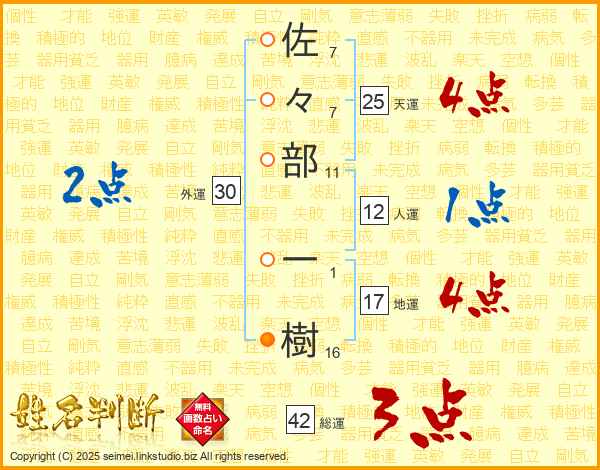 佐(7画)々(7画)部(11画) 一(1画)樹(16画)