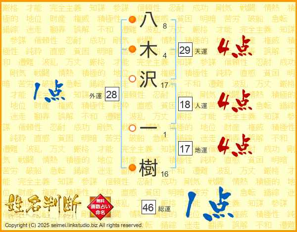 八(8画)木(4画)沢(17画) 一(1画)樹(16画)