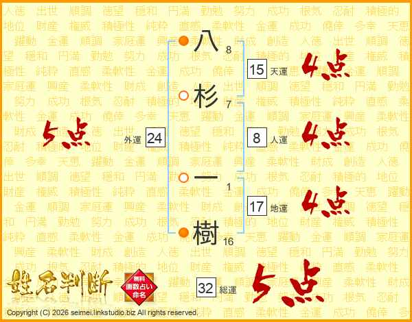 家系が持つ宿命的な運勢を表します。祖先から受け継いだ苗字ですので自分の力が及びません。家柄を象徴します。苗字の合計画数。