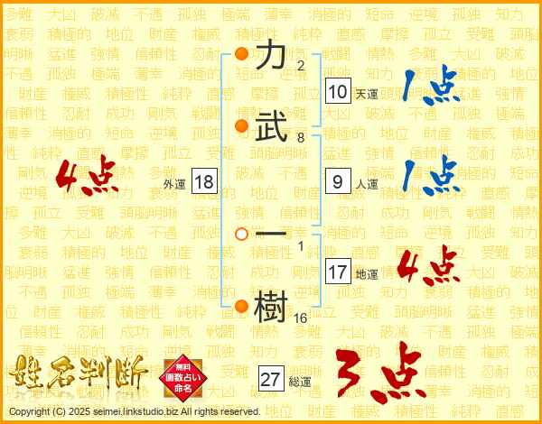 力(2画)武(8画) 一(1画)樹(16画)