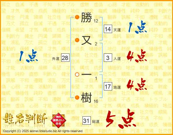 生活面を象徴する運勢です。外部から受ける影響力を表し、結婚運、家庭運や職場、環境への順応性を表します。総運から人運を引いた画数。姓や名が1文字の場合を除く。
