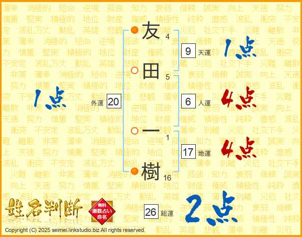 生活面を象徴する運勢です。外部から受ける影響力を表し、結婚運、家庭運や職場、環境への順応性を表します。総運から人運を引いた画数。姓や名が1文字の場合を除く。