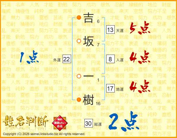 吉(6画)坂(7画) 一(1画)樹(16画)