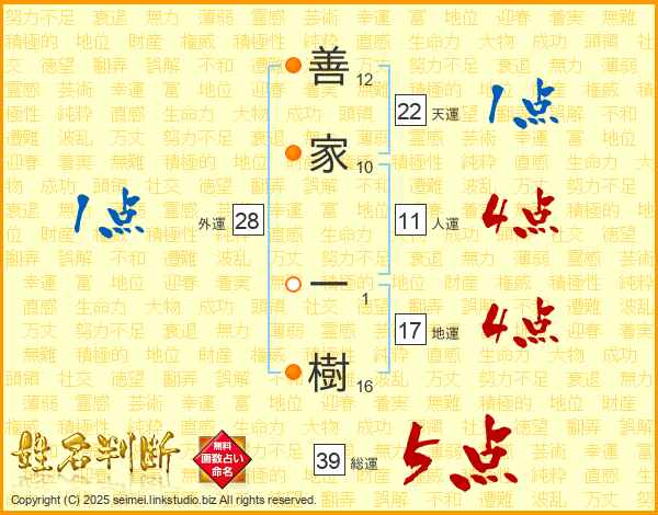 生活面を象徴する運勢です。外部から受ける影響力を表し、結婚運、家庭運や職場、環境への順応性を表します。総運から人運を引いた画数。姓や名が1文字の場合を除く。