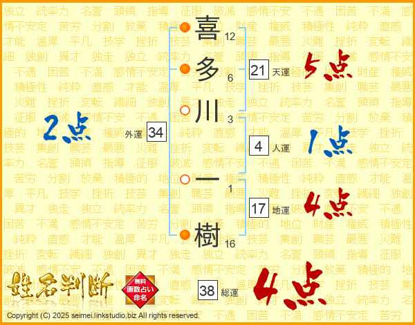 喜(12画)多(6画)川(3画) 一(1画)樹(16画)
