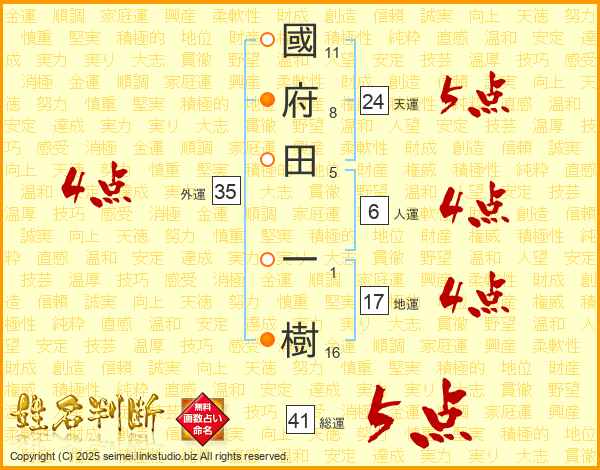 國(11画)府(8画)田(5画) 一(1画)樹(16画)