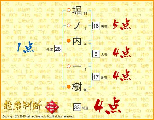 堀(11画)ノ(1画)内(4画) 一(1画)樹(16画)