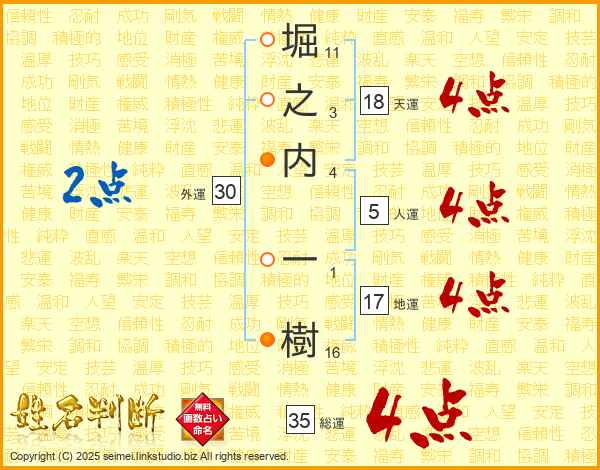 堀(11画)之(3画)内(4画) 一(1画)樹(16画)
