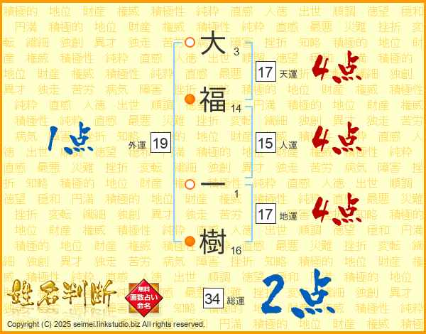 生活面を象徴する運勢です。外部から受ける影響力を表し、結婚運、家庭運や職場、環境への順応性を表します。総運から人運を引いた画数。姓や名が1文字の場合を除く。