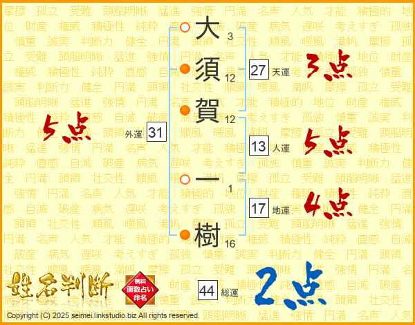 大(3画)須(12画)賀(12画) 一(1画)樹(16画)