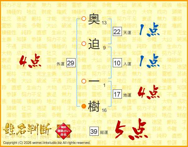 奥(13画)迫(9画) 一(1画)樹(16画)