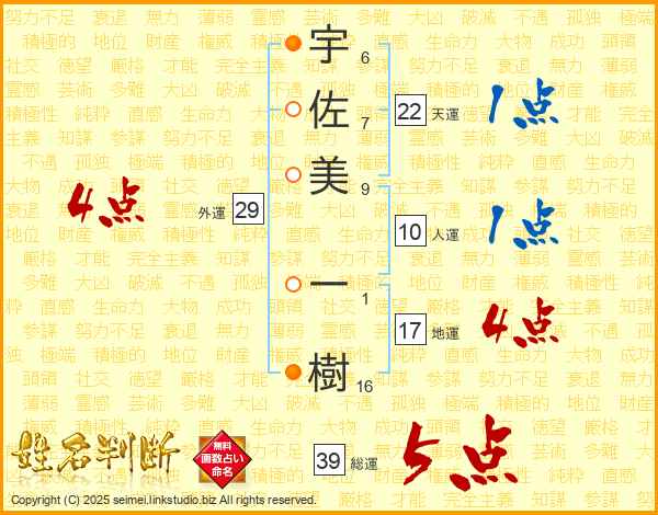 宇(6画)佐(7画)美(9画) 一(1画)樹(16画)