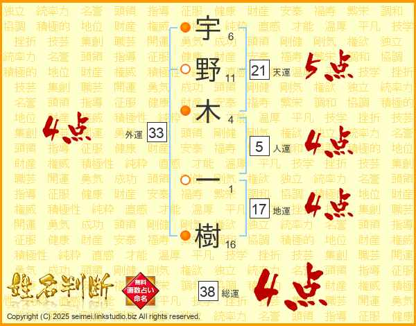 宇(6画)野(11画)木(4画) 一(1画)樹(16画)