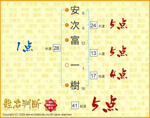 安(6画)次(6画)富(12画) 一(1画)樹(16画)