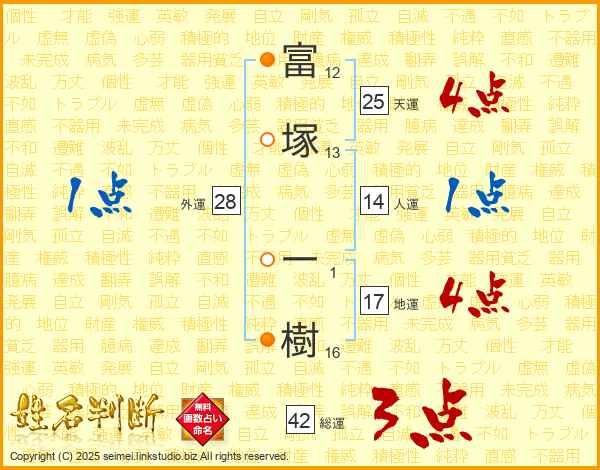 あなたの人生を表す1番重要な運勢です。生涯を通じて影響する総合運となり、主に50歳以降の晩年期に影響を及ぼします。苗字と名前の合計画数。