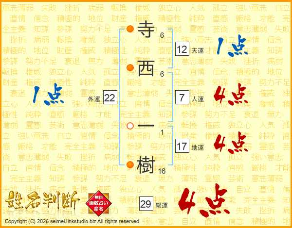 寺西一樹さんの地運は17画の4点!