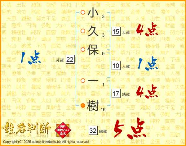 小(3画)久(3画)保(9画) 一(1画)樹(16画)