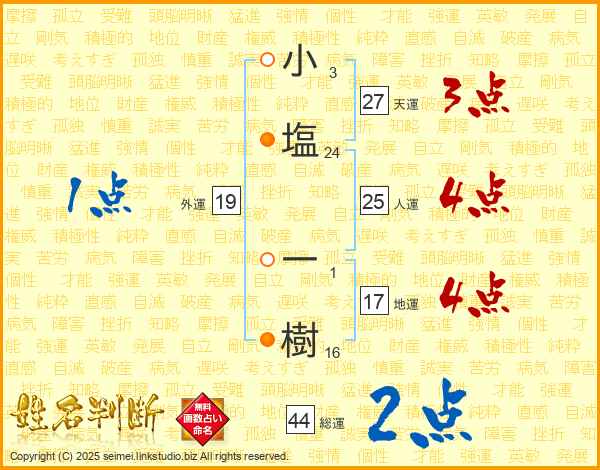 生活面を象徴する運勢です。外部から受ける影響力を表し、結婚運、家庭運や職場、環境への順応性を表します。総運から人運を引いた画数。姓や名が1文字の場合を除く。