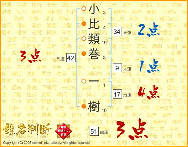 小(3画)比(4画)類(19画)巻(8画) 一(1画)樹(16画)