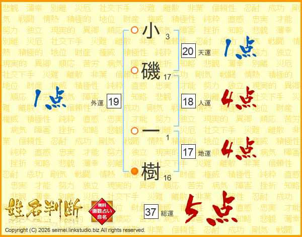 生活面を象徴する運勢です。外部から受ける影響力を表し、結婚運、家庭運や職場、環境への順応性を表します。総運から人運を引いた画数。姓や名が1文字の場合を除く。