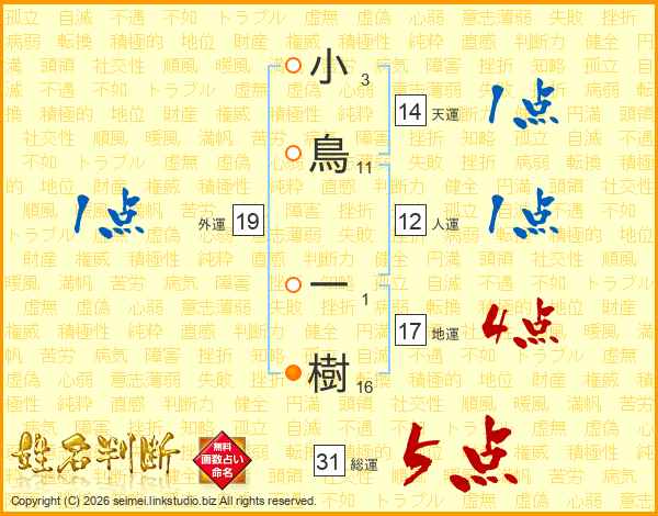 小鳥一樹さんの総運は31画の5点!