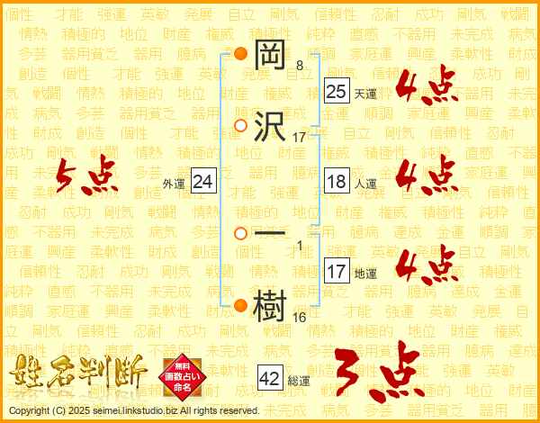 岡(8画)沢(17画) 一(1画)樹(16画)