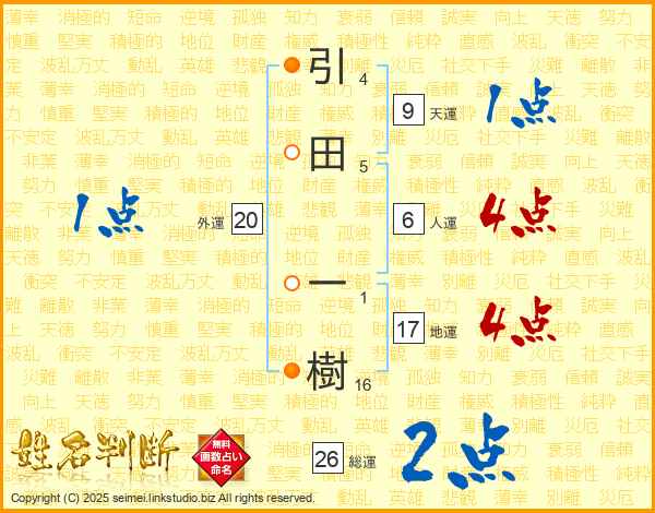 生活面を象徴する運勢です。外部から受ける影響力を表し、結婚運、家庭運や職場、環境への順応性を表します。総運から人運を引いた画数。姓や名が1文字の場合を除く。