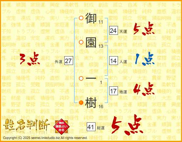 生活面を象徴する運勢です。外部から受ける影響力を表し、結婚運、家庭運や職場、環境への順応性を表します。総運から人運を引いた画数。姓や名が1文字の場合を除く。