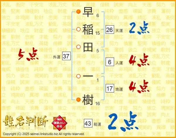 早(6画)稲(15画)田(5画) 一(1画)樹(16画)
