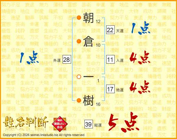 朝(12画)倉(10画) 一(1画)樹(16画)