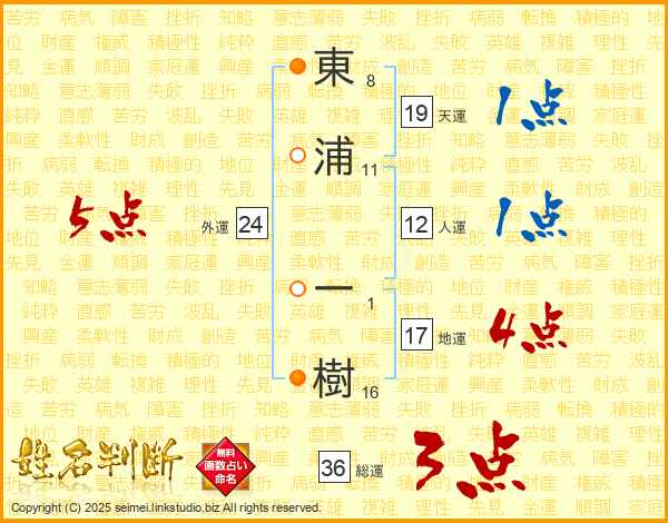 生活面を象徴する運勢です。外部から受ける影響力を表し、結婚運、家庭運や職場、環境への順応性を表します。総運から人運を引いた画数。姓や名が1文字の場合を除く。