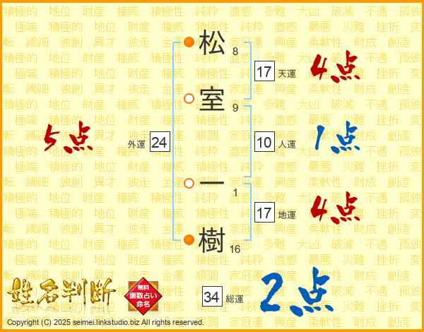 あなたの人生を表す1番重要な運勢です。生涯を通じて影響する総合運となり、主に50歳以降の晩年期に影響を及ぼします。苗字と名前の合計画数。