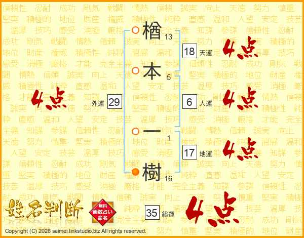 楢本一樹さんの総運は35画の4点!