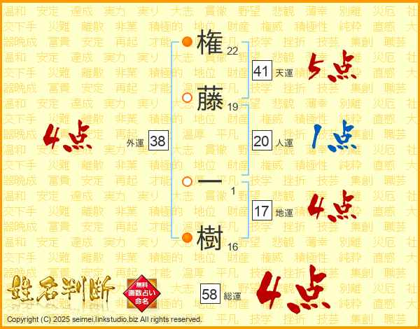 生活面を象徴する運勢です。外部から受ける影響力を表し、結婚運、家庭運や職場、環境への順応性を表します。総運から人運を引いた画数。姓や名が1文字の場合を除く。