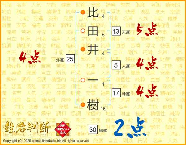 比(4画)田(5画)井(4画) 一(1画)樹(16画)