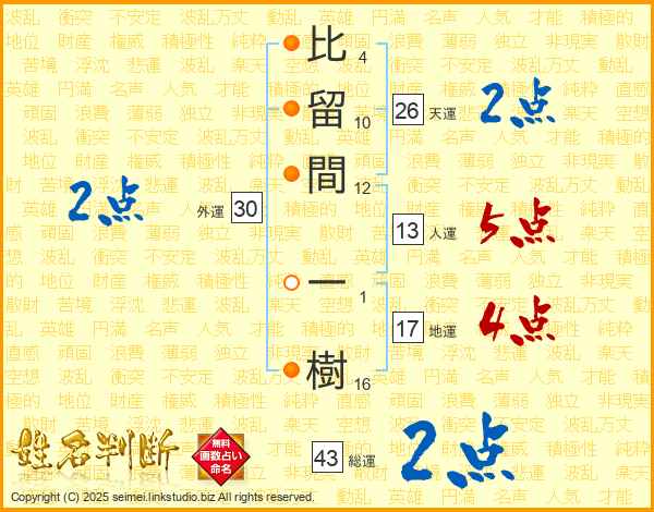 あなたの人生を表す1番重要な運勢です。生涯を通じて影響する総合運となり、主に50歳以降の晩年期に影響を及ぼします。苗字と名前の合計画数。