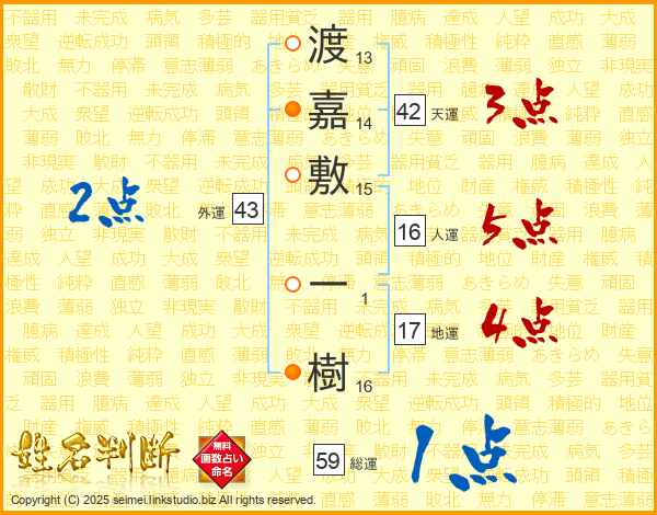 あなたの人生を表す1番重要な運勢です。生涯を通じて影響する総合運となり、主に50歳以降の晩年期に影響を及ぼします。苗字と名前の合計画数。