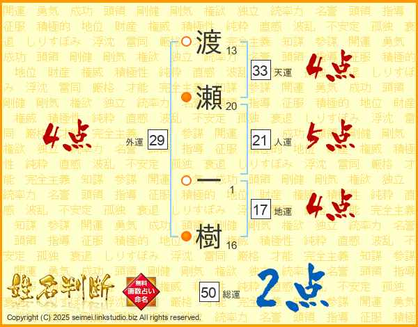 渡(13画)瀬(20画) 一(1画)樹(16画)