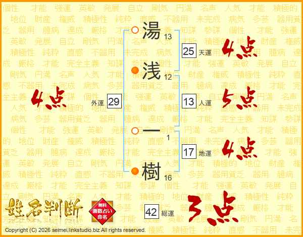 湯(13画)浅(12画) 一(1画)樹(16画)