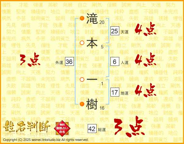 あなたの人生を表す1番重要な運勢です。生涯を通じて影響する総合運となり、主に50歳以降の晩年期に影響を及ぼします。苗字と名前の合計画数。