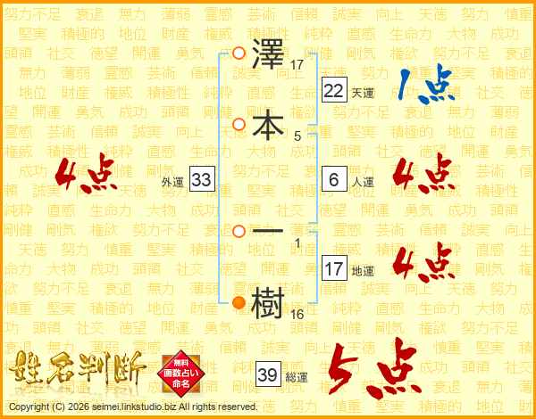 澤本一樹さんの総運は39画の5点!