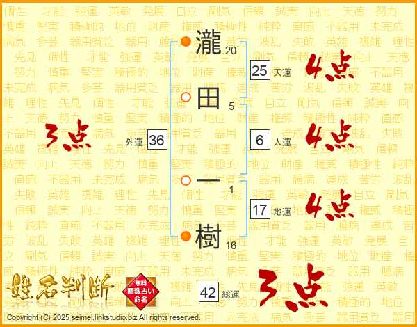 瀧(20画)田(5画) 一(1画)樹(16画)