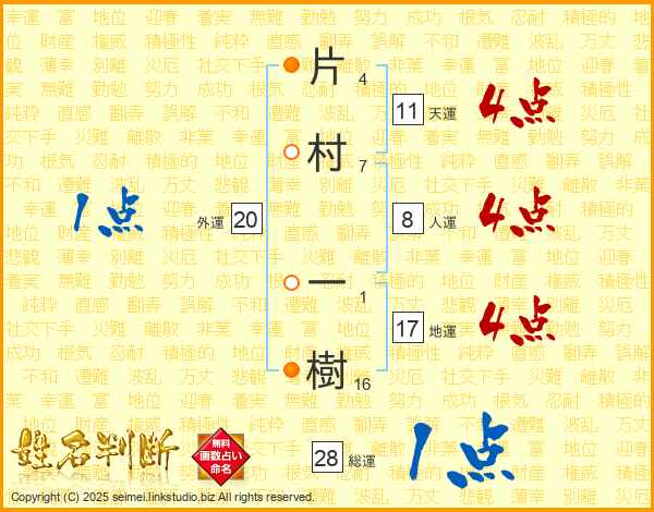 あなたの人生を表す1番重要な運勢です。生涯を通じて影響する総合運となり、主に50歳以降の晩年期に影響を及ぼします。苗字と名前の合計画数。