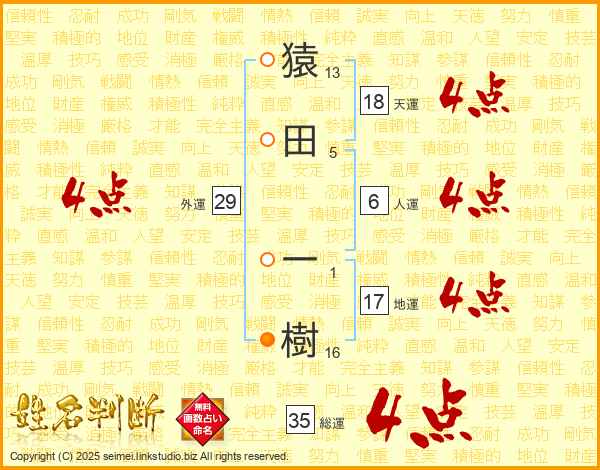 生活面を象徴する運勢です。外部から受ける影響力を表し、結婚運、家庭運や職場、環境への順応性を表します。総運から人運を引いた画数。姓や名が1文字の場合を除く。