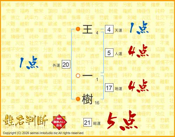 生活面を象徴する運勢です。外部から受ける影響力を表し、結婚運、家庭運や職場、環境への順応性を表します。総運から人運を引いた画数。姓や名が1文字の場合を除く。