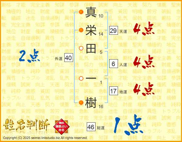 真(10画)栄(14画)田(5画) 一(1画)樹(16画)