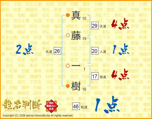 あなたの人生を表す1番重要な運勢です。生涯を通じて影響する総合運となり、主に50歳以降の晩年期に影響を及ぼします。苗字と名前の合計画数。