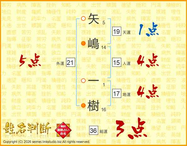 矢(5画)嶋(14画) 一(1画)樹(16画)