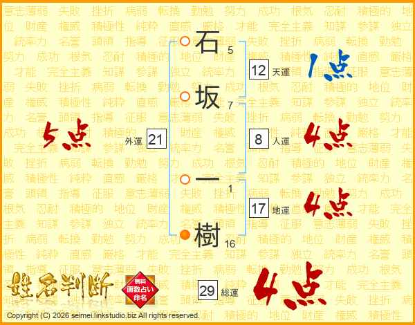 石坂一樹さんの総運は29画の4点!