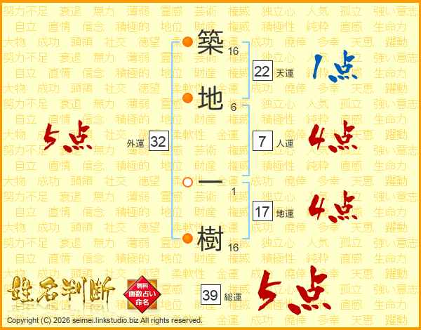 築地一樹さんの総運は39画の5点!